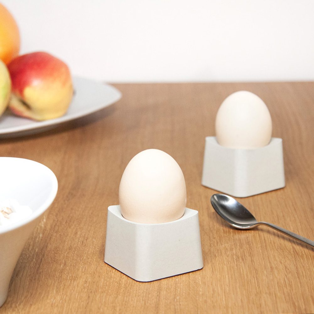 Unser Eierbecher Eddy setzt ganz auf filigrane Schlichtheit ohne große Umschweife und schafft eine ästhetische Verbindung zwischen runden und eckigen Formen. Wasser- und schmutzabweisend geschützt durch eine lebensmittelechte Versiegelung kannst du deinen Eierbecher mit einem milden Spülmittel und einem weichen Schwamm unter fließendem Wasser reinigen. Auch um die Oberfläche deiner Möbel brauchst du dir keine Sorgen machen, denn jedes unserer Betonaccessoires ist auf der Unterseite mit einem Kratzschutz aus wasserabweisendem Kunstleder versehen. Dadurch kannst du den Eierbecher bedenkenlos ohne Untersetzer auf deinem Tisch oder Sideboard verwenden.