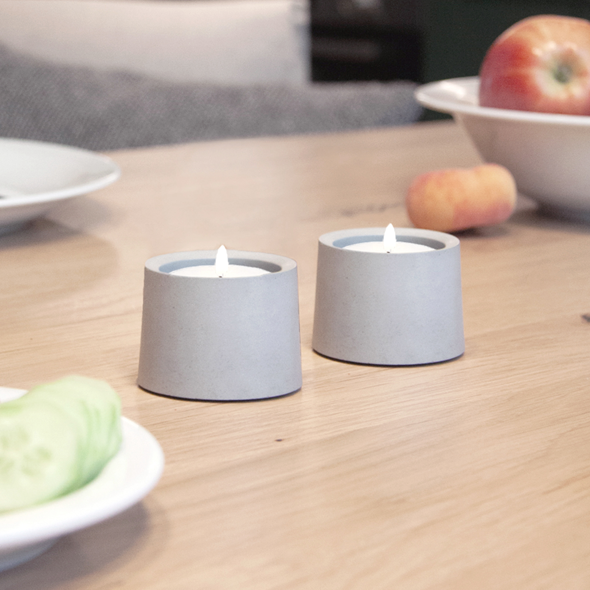 Unser Teelicht Eddy R setzt ganz auf filigrane Schlichtheit ohne große Umschweife und schafft eine ästhetische Verbindung zwischen runden und eckigen Formen. Wasser- und schmutzabweisend geschützt durch eine lebensmittelechte Versiegelung kannst du dein Teelicht Eddy E mit einem milden Spülmittel und einem weichen Schwamm unter fließendem Wasser reinigen. Auch um die Oberfläche deiner Möbel brauchst du dir keine Sorgen machen, denn jedes unserer Betonaccessoires ist auf der Unterseite mit einem Kratzschutz aus wasserabweisendem Kunstleder versehen. Dadurch kannst du das Teelicht Eddy E bedenkenlos ohne Untersetzer auf deinem Tisch oder Sideboard verwenden.